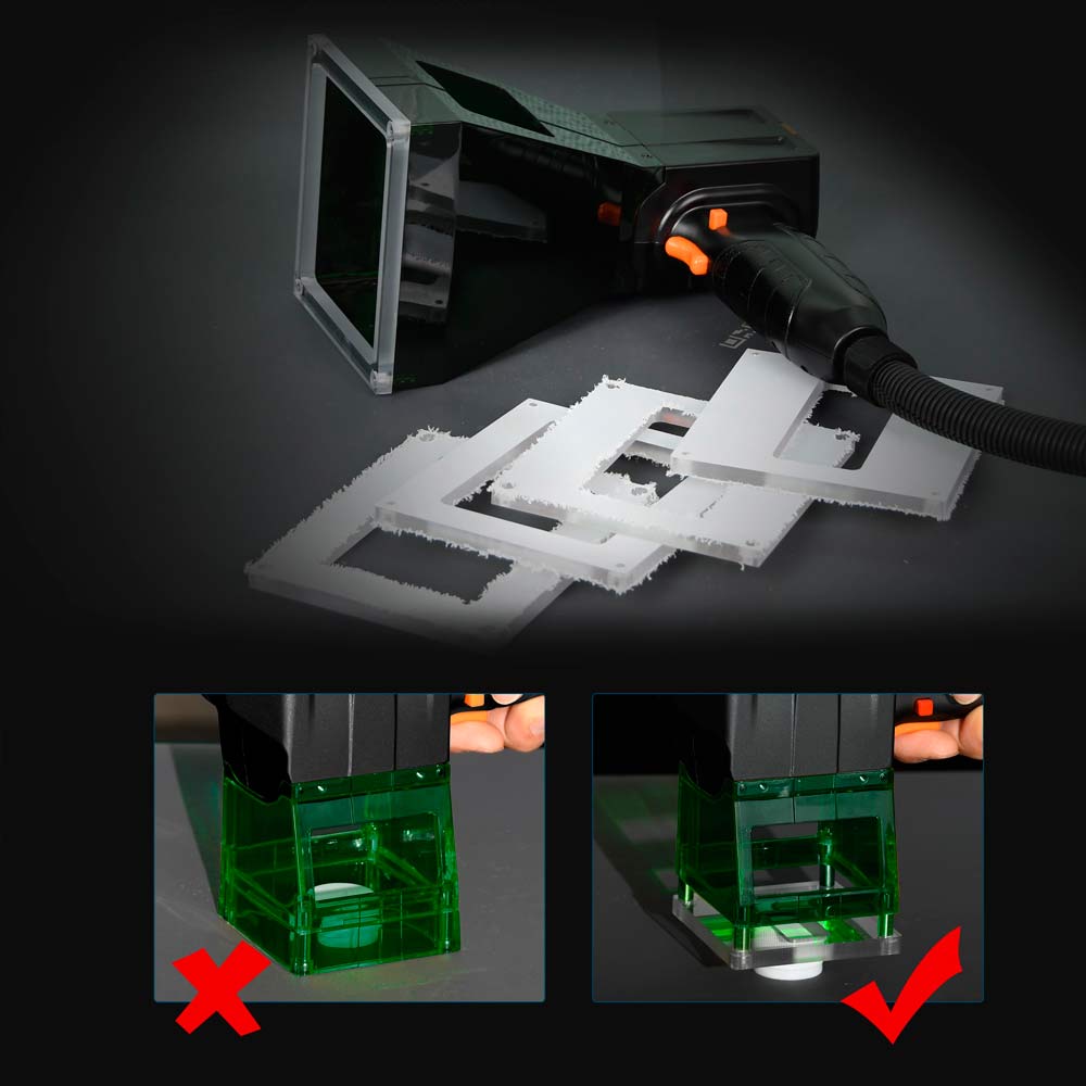Diese orangefarbenen Abdeckungen dienen ausschließlich dazu, den optimalen Abstand (Brennweite) zwischen der Laserlinse (Ausgang) und der zu markierenden Oberfläche sicherzustellen. Außerdem verhindern sie, dass dieser Abstand unterschritten wird.