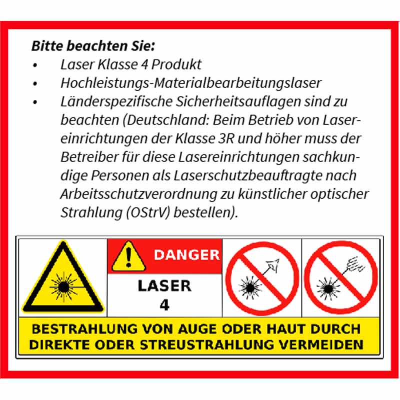 Achtung: Wir empfehlen grundsätzlich eine räumliche Abschirmung. D.h. Der Laser sollte nur in einem gesicherten Bereich oder geschlossenem Raum und nur durch geschultes Personal verwendet werden.