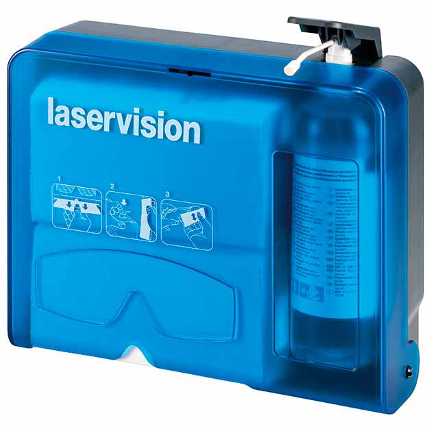 Die professionelle Reinigungsstation ist zur Wandmontage vorgesehen und findet somit Platz in jedem Raum. Im Lieferumfang ist ein Reinigungsfluid mit einem passenden Kunststoffspender sowie speziell auf die Eigenschaften von Laserschutzfiltern passende, holzfreie Reinigungstücher. Die Kombination dieser beiden Produkte ermöglicht eine schonende und gründliche Reinigung und gewährleistet eine lange Lebensdauer der Brille bzw. der Laserschutzfilter.