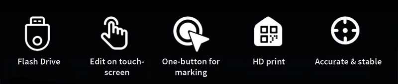 Über das integrierte Touchpad bzw. mit der einfachen Bedien-Software können individuelle QR-Codes, Bar-Codes und Seriennummern, Logos und Grafiken generiert, gespeichert und markiert werden. Logos oder Grafiken können über einen USB Stick einfach übertragen werden. Ihre Daten speichern Sie direkt auf dem Gerät oder auf einem externen Speichergerät wie z.B. einen USB Stick oder PC.